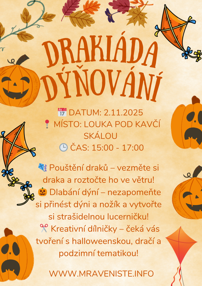 Co? pouštění draků, dlabání dýní (dýně a nožíky s sebou), kreativní dílničky s halloweenskou, dračí a podzimní tématikou